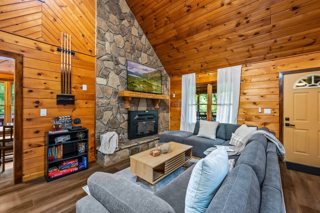 💛 Why You’ll Love It • Heated Year-Round Pool/Spa: Relax those muscles or let the kids splash around—fits up to 12 people with hydrotherapy jets! • Games Galore: From Nintendo Switch and pool table to karaoke and laser tag, boredom doesn’t stand a chance. • Wraparound Decks w/ Mountain Views: Sip morning coffee by the fire pit table or dine outdoors with space for 12. • Cozy Indoor Spaces: Smart TVs, fireplaces, and even a skylight reading nook offer perfect spots to unwind after big adventures. • Perfect for Groups: 7 comfy beds across 3 floors—including 4 king bedrooms, make sure everyone sleeps well. 🧸 Designed for All Ages: • Pack n’ Play + highchair for littles • Kid-friendly cups, plates, and utensils! • Board games, cornhole, life-size Connect 4 for families • DVD library, karaoke, and arcade for nostalgic fun • Full Coffee bar + reading nook for cozy mornings 🚗 Location Highlights (all times are approx): • 10 min to Goats on the Roof • 15 min to Pigeon Forge attractions & restaurants • 25 min to Dollywood • 30 min to Smoky Mountains National Park Located in scenic Walden’s Creek with paved, accessible roads and parking for 5 vehicles. 🏡 Your Home Base Includes: • 2,200 sq ft cabin w/ 5 bedrooms, 3 baths • Fully stocked kitchen: stainless appliances + waffle maker, slow cooker, blender, Keurig Duo & more • Coffee Bar w/ Keurig Duo, French press, and starter supplies • Indoor dining for 12 + outdoor dining for 12 • Smart 4K TVs in all rooms + satellite WiFi 🔥 Extra Fun: • Ms. Pac-Man multi-arcade • Nintendo Switch w/ 4 controllers & popular games like SuperMario Kart! • Laser tag gear • Karaoke machine w/ wireless mics • Pool table + cues • Board games, movies, and books • Outdoor fire pit table, Connect 4, Jenga, & cornhole ✍️ Good to Know: • No pets, no smoking • Satellite WiFi – great for streaming & browsing • 4WD recommended in snowy conditions • Starter supplies included (shampoo & shower gel, toilet paper, and paper towels) • Cell service may vary – you're in the mountains! 🐻 Stonehaven Bliss = Relaxation + Adventure Tucked into a wooded hillside, you’ll get the peace of mountain life without being too far from the fun. Watch for wildlife, take in the crisp air, and enjoy all the thoughtful touches that make this cabin feel like home. ✅ Ready to Book? Secure your dates now and get ready to make memories that last a lifetime! Feel free to reach out with any questions! We are always more than happy to help. :)